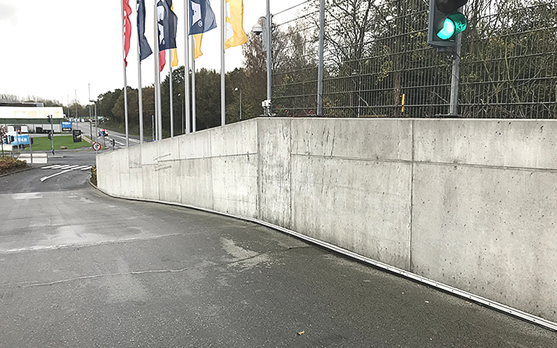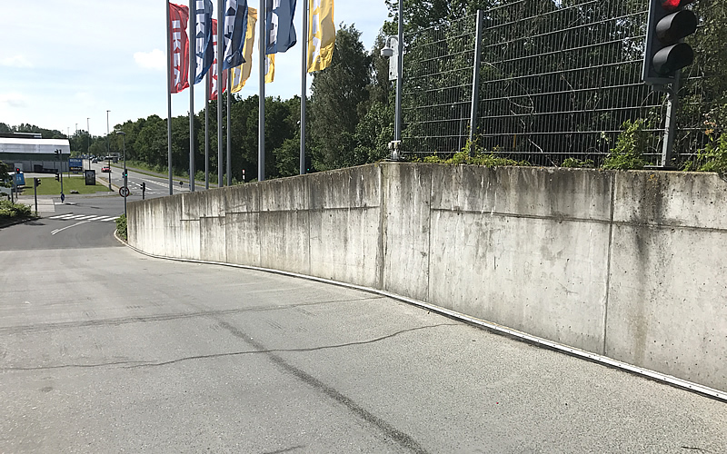 Rundt om det 55.000 m2 store varehus er p-pladserne og indkørslerne omkranset af meterlange betonvægge.